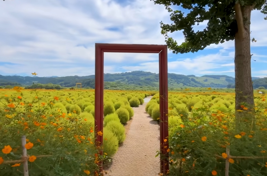 황화코스모스, 백일홍, 메리골드 등 가을꽃도 풍성하게 피어 있어 어느 자리에서나 인생샷을 남길 수 있습니다. 곳곳의 나무 프레임과 그네 의자는 인기 포토존이에요.